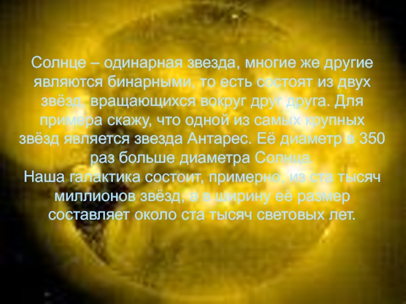состоят из двух звёзд, вращающихся вокруг друг друга. Для примера скажу, что одной из самых крупных звёзд является звезда Антарес. Её диаметр в 350 раз больше диаметра Солнца.
