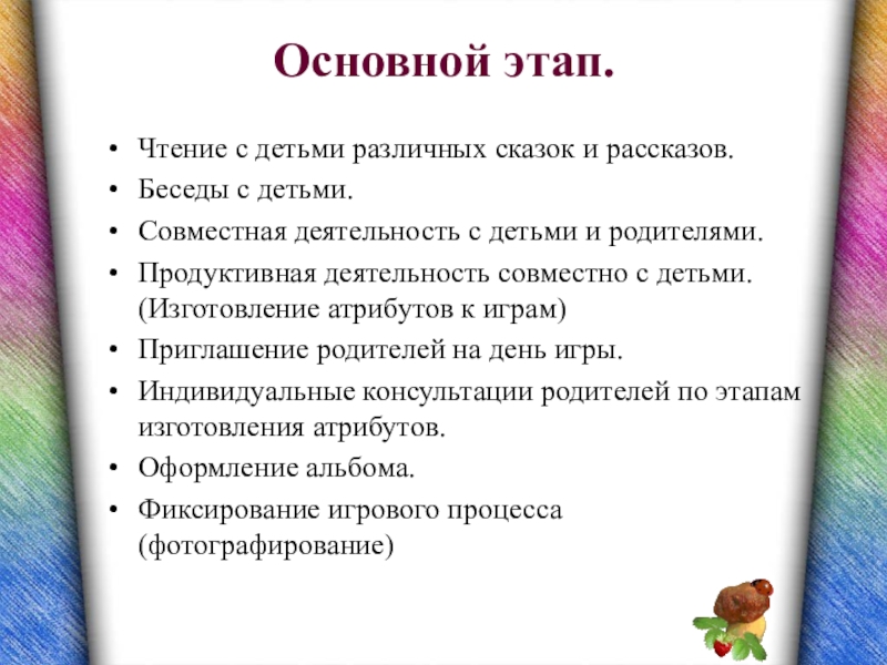 Основной этап.Чтение с детьми различных сказок и рассказов.Беседы с детьми.Совместная деятельность с детьми и родителями.Продуктивная деятельность совместно