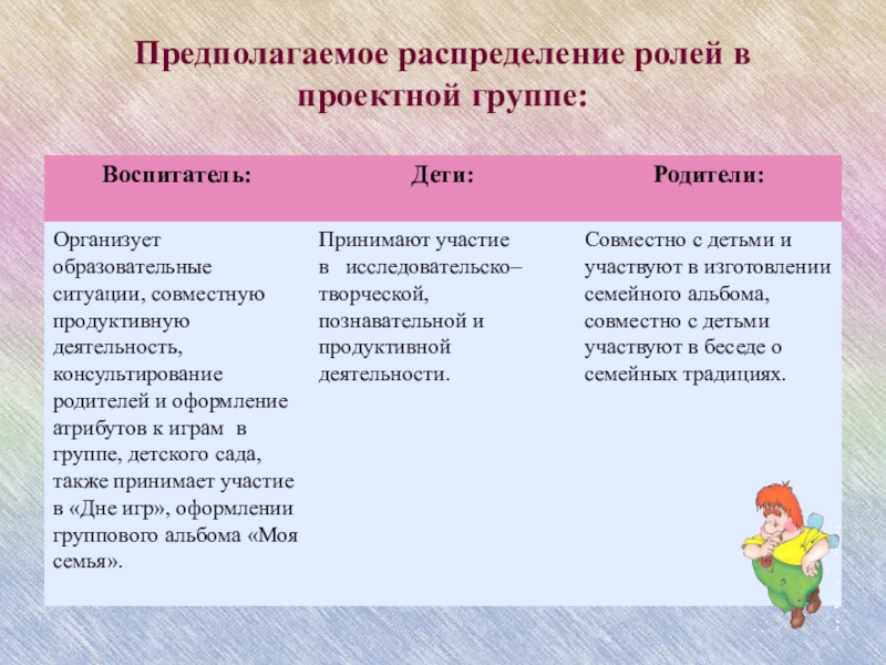 Слайд 6Предполагаемое распределение ролей в проектной группе: