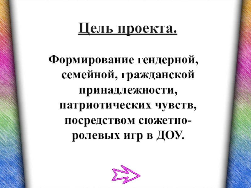 Цель проекта.Формирование гендерной, семейной, гражданской принадлежности, патриотических чувств, посредством сюжетно-ролевых игр в ДОУ.