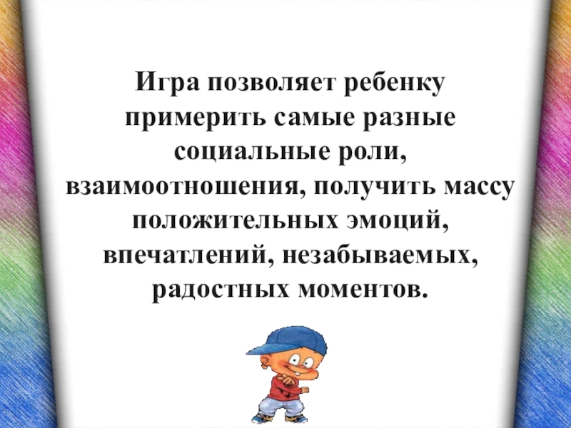 Игра позволяет ребенку примерить самые разные социальные роли, взаимоотношения, получить массу положительных эмоций, впечатлений, незабываемых, радостных моментов.