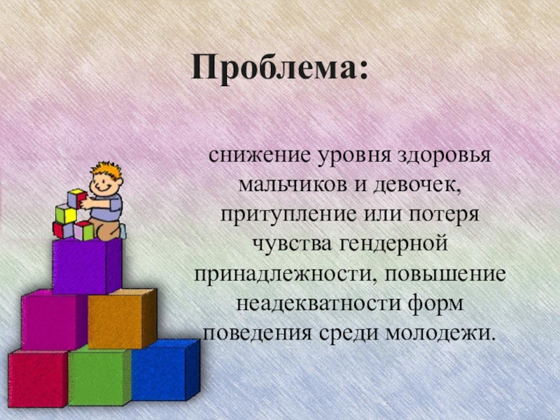 Проблема:снижение уровня здоровья мальчиков и девочек, притупление или потеря чувства гендерной принадлежности, повышение неадекватности форм поведения среди