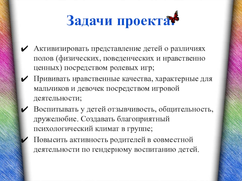 Задачи проекта:Активизировать представление детей о различиях полов (физических, поведенческих и нравственно ценных) посредством ролевых игр;Прививать нравственные качества,