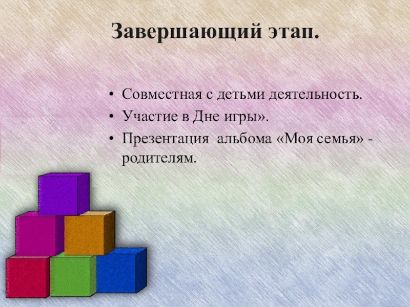 Завершающий этап.Совместная с детьми деятельность.Участие в Дне игры».Презентация альбома «Моя семья» - родителям.