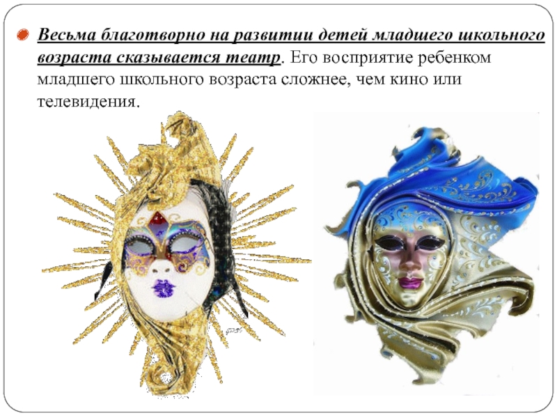 Слайд 6Весьма благотворно на развитии детей младшего школьного возраста сказывается театр. Его