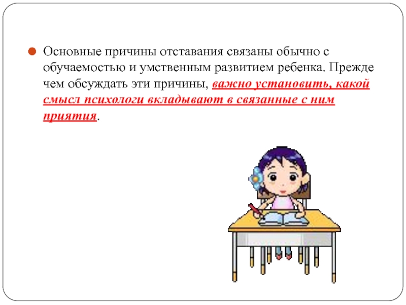 Слайд 10Основные причины отставания связаны обычно с обучаемостью и умственным развитием ребенка.