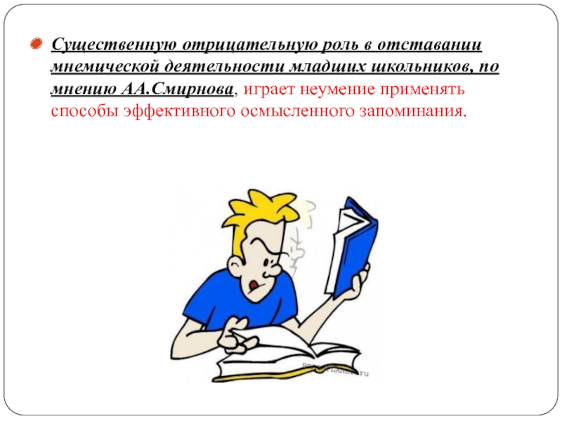 Слайд 11Существенную отрицательную роль в отставании мнемической деятельности младших школьников, по мнению