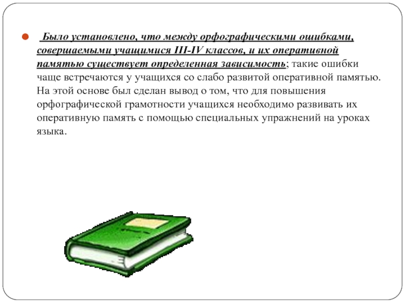 и их оперативной памятью существует определенная зависимость; такие ошибки чаще встречаются у учащихся со слабо развитой оперативной памятью. На этой основе был сделан вывод о том, что для повышения орфографической грамотности учащихся необходимо развивать их оперативную память с помощью специальных упражнений на уроках языка.