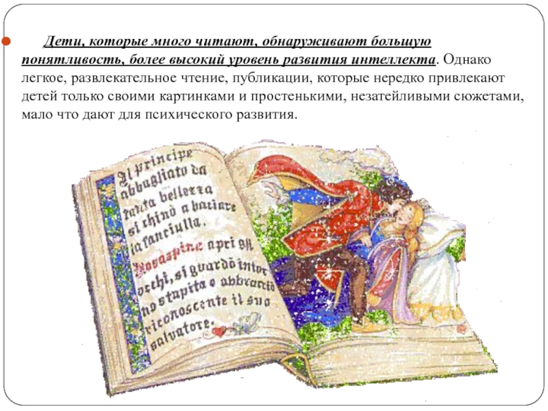 развития интеллекта. Однако легкое, развлекательное чтение, публикации, которые нередко привлекают детей только своими картинками и простенькими, незатейливыми сюжетами, мало что дают для психического развития.
