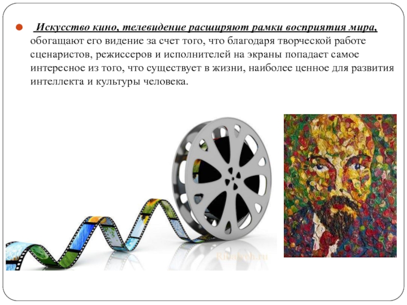 Слайд 5 Искусство кино, телевидение расширяют рамки восприятия мира, обогащают его видение