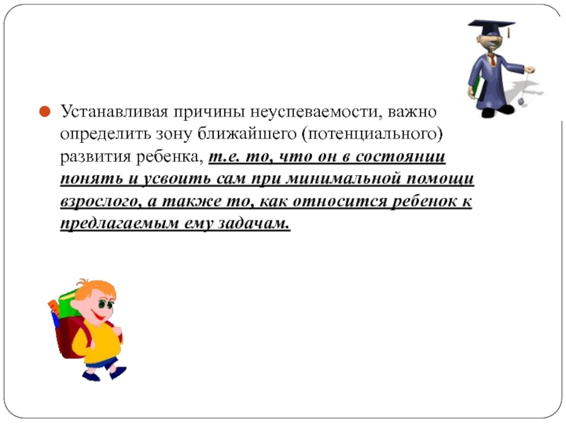 Слайд 15Устанавливая причины неуспеваемости, важно определить зону ближайшего (потенциального) развития ребенка, т.е.