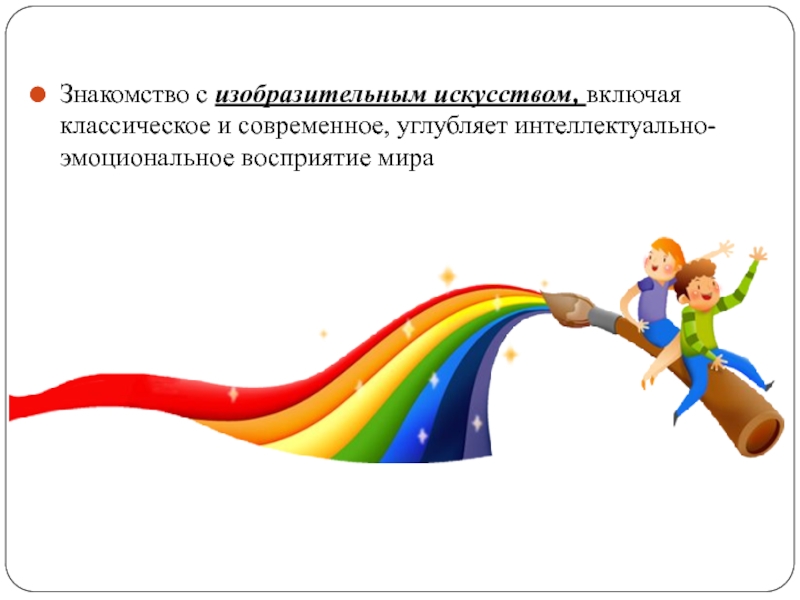 Слайд 3Знакомство с изобразительным искусством, включая классическое и современное, углубляет интеллектуально-эмоциональное восприятие