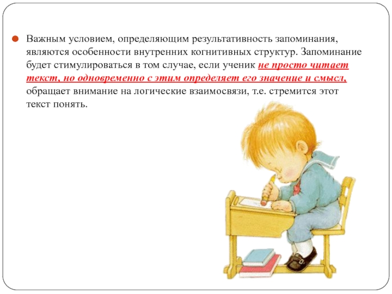 Слайд 13Важным условием, определяющим результативность запоминания, являются особенности внутренних когнитивных структур. Запоминание