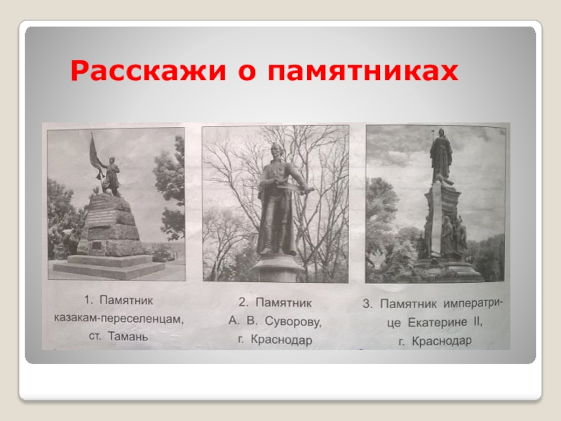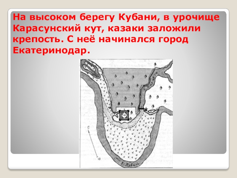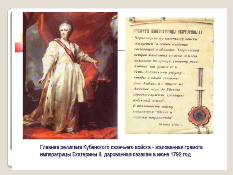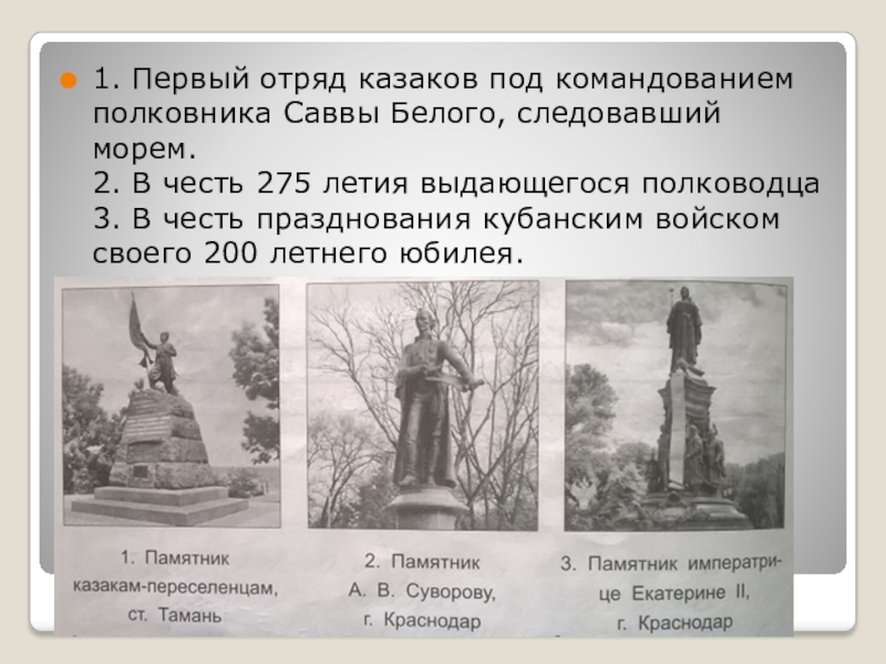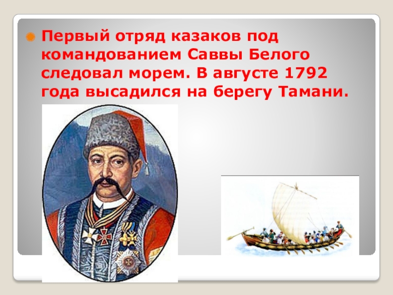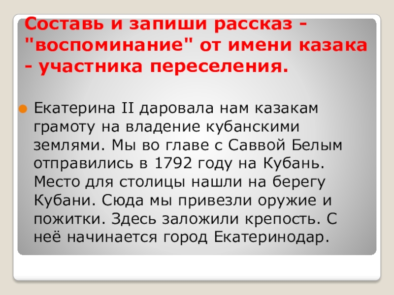Екатерина II даровала нам казакам грамоту на владение кубанскими землями. Мы во главе с Саввой Белым отправились в 1792 году на Кубань. Место для столицы нашли на берегу Кубани. Сюда мы привезли оружие и пожитки. Здесь заложили крепость. С неё начинается город Екатеринодар.