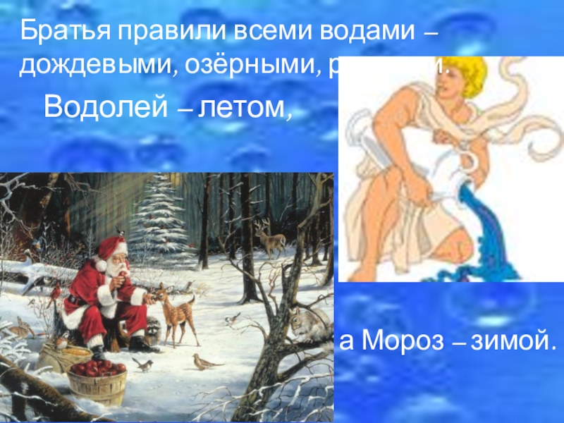 Братья правили всеми водами – дождевыми, озёрными, речными.Водолей – летом,а Мороз – зимой.