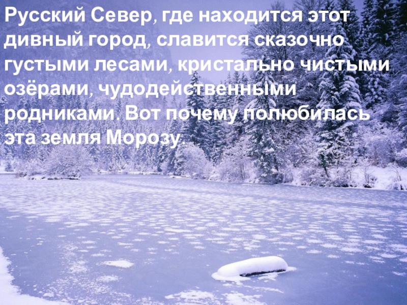 Слайд 7Русский Север, где находится этот дивный город, славится сказочно густыми лесами,