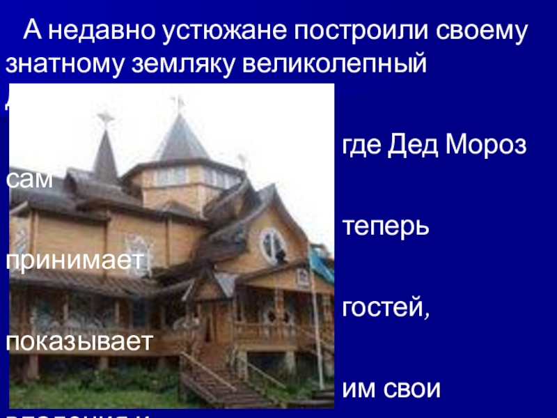 А недавно устюжане построили своему знатному земляку великолепный деревянный терем,