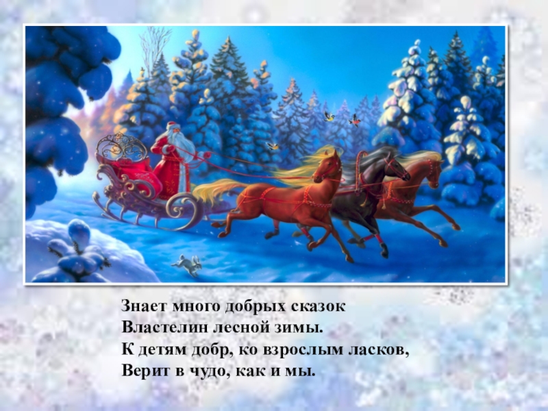 Слайд 10Знает много добрых сказок Властелин лесной зимы. К детям добр, ко взрослым ласков, Верит