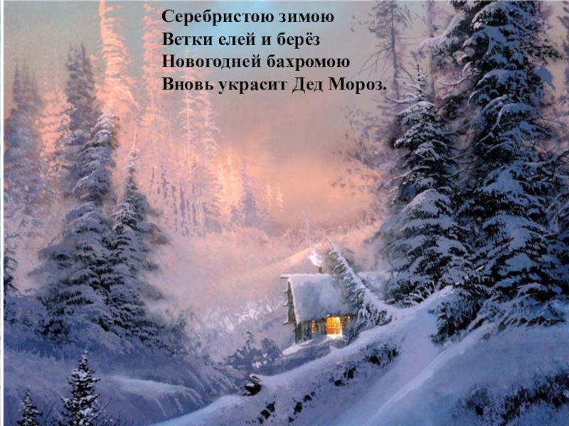 Слайд 8Серебристою зимою Ветки елей и берёз Новогодней бахромою Вновь украсит Дед Мороз.