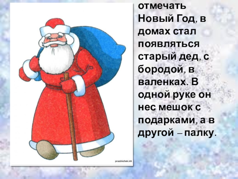 домах стал появляться старый дед, с бородой, в валенках. В одной руке он нес мешок с подарками, а в другой – палку.