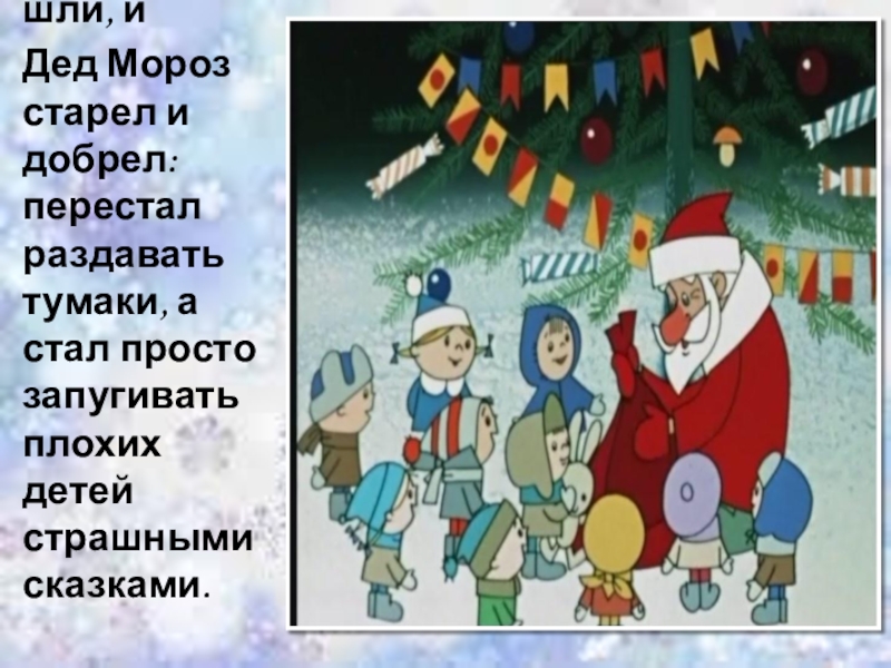 Но годы шли, и Дед Мороз старел и добрел: перестал раздавать тумаки, а стал просто запугивать плохих