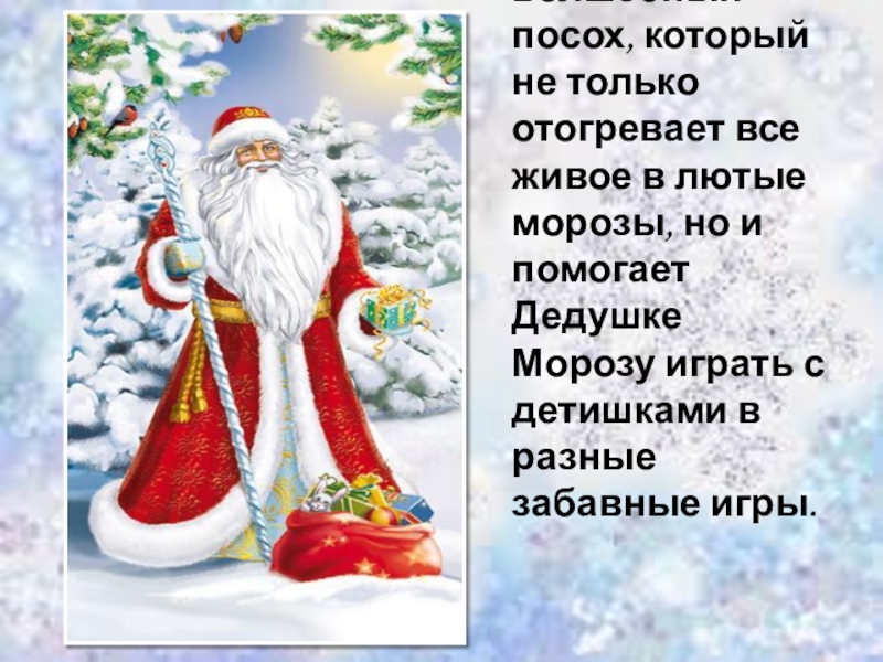 живое в лютые морозы, но и помогает Дедушке Морозу играть с детишками в разные забавные игры.