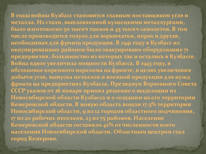Революция в экономике ознаменовалась переходом к плановому ведению хозяйства. В первом плане ГОЭЛРО важное место отводится созданию урало-кузбасского индустриального комплекса. Кузбасс превращается в огромную строительную площадку. Продолжает развиваться угольная промышленность, заложены основы металлургической и химической отраслей. Развивается энергетика. Индустриализация меняет облик края. Вокруг строящихся объектов вырастают рабочие поселки, очень скоро получавшие статус городов.