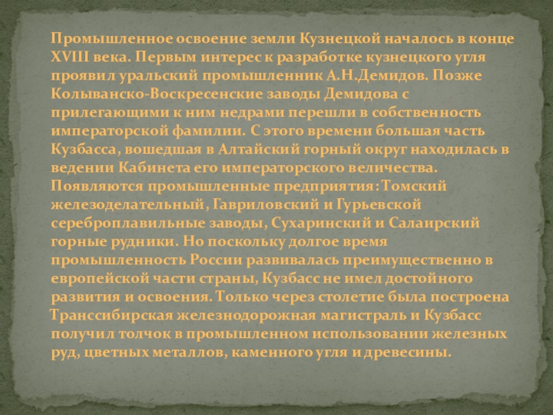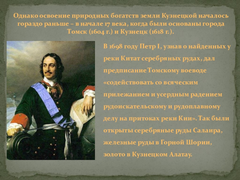 Однако освоение природных богатств земли Кузнецкой началось гораздо раньше – в начале 17 века, когда были основаны города Томск (1604 г.) и Кузнецк (1618 г.).