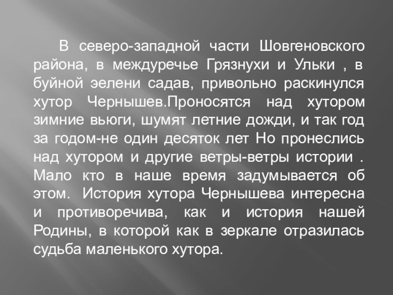 Ульки , в буйной эелени садав, привольно раскинулся хутор Чернышев.Проносятся над хутором зимние вьюги, шумят летние дожди, и так год за годом-не один десяток лет Но пронеслись над хутором и другие ветры-ветры истории .Мало кто в наше время задумывается об этом. История хутора Чернышева интересна и противоречива, как и история нашей Родины, в которой как в зеркале отразилась судьба маленького хутора.