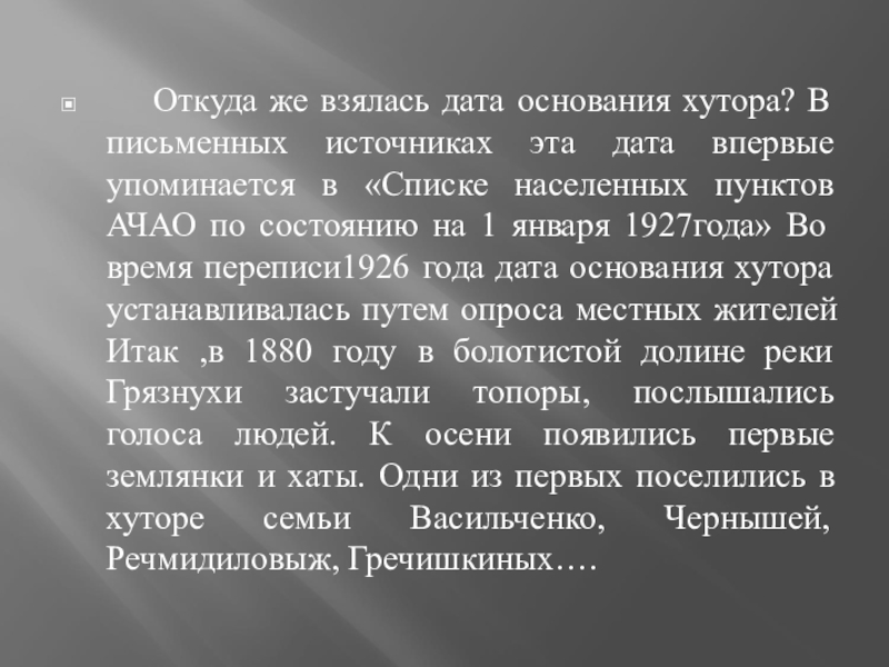 эта дата впервые упоминается в «Списке населенных пунктов АЧАО по состоянию на 1 января 1927года» Во время переписи1926 года дата основания хутора устанавливалась путем опроса местных жителей Итак ,в 1880 году в болотистой долине реки Грязнухи застучали топоры, послышались голоса людей. К осени появились первые землянки и хаты. Одни из первых поселились в хуторе семьи Васильченко, Чернышей, Речмидиловыж, Гречишкиных….