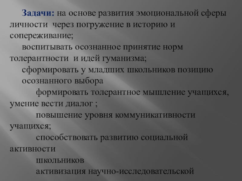 Задачи: на основе развития эмоциональной сферы личности через погружение в историю и сопереживание; воспитывать осознанное принятие норм толерантности и идей гуманизма;сформировать у младших школьников позицию осознанного выбора формировать толерантное мышление учащихся, умение вести диалог