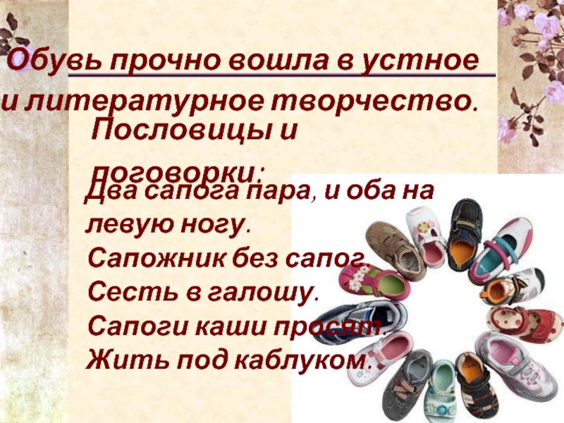 Пословицы и поговорки:Обувь прочно вошла в устное и литературное творчество. Два сапога пара, и оба на левую