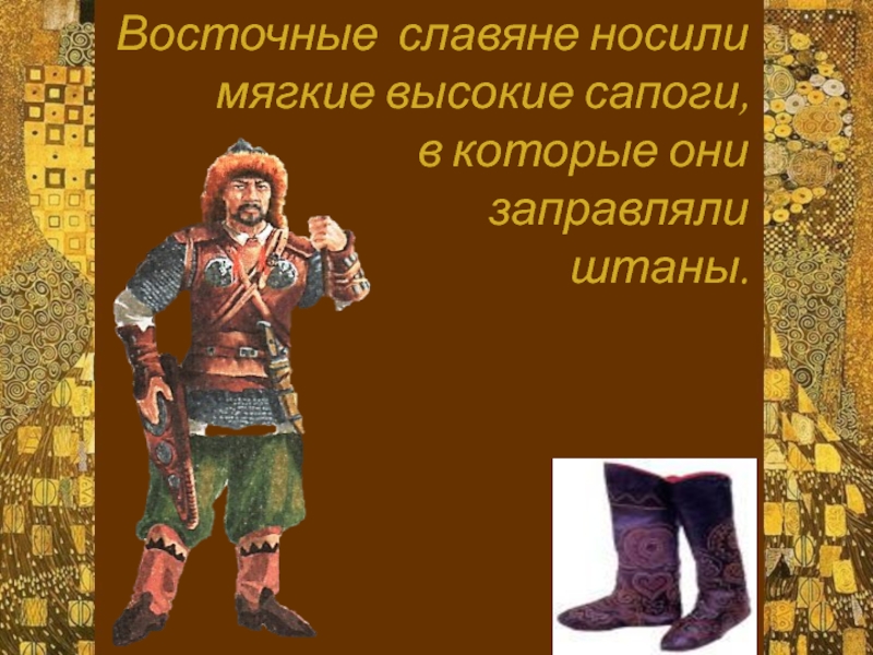 Восточные славяне носили	  	 мягкие высокие сапоги, 	в которые они заправляли штаны.