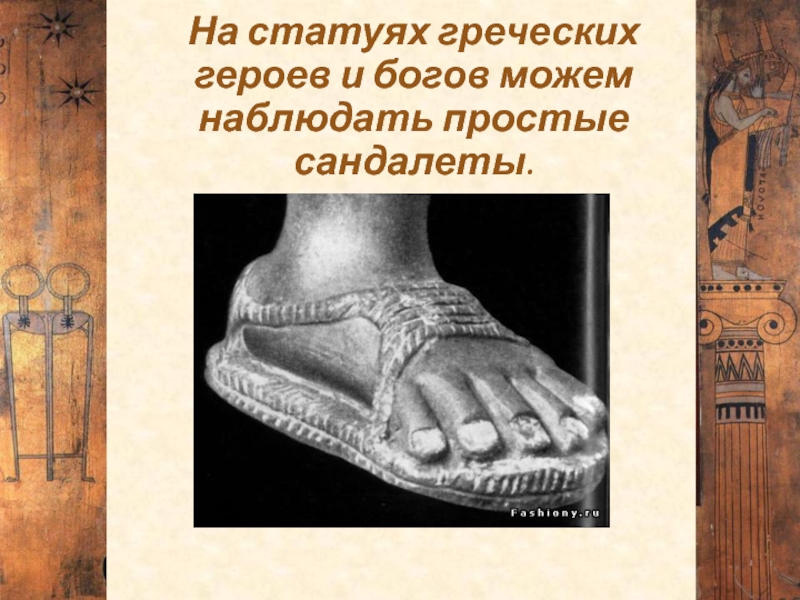 Слайд 6На статуях греческих героев и богов можем наблюдать простые сандалеты.