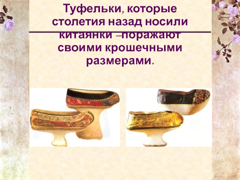 Слайд 10Туфельки, которые столетия назад носили китаянки –поражают своими крошечными размерами.
