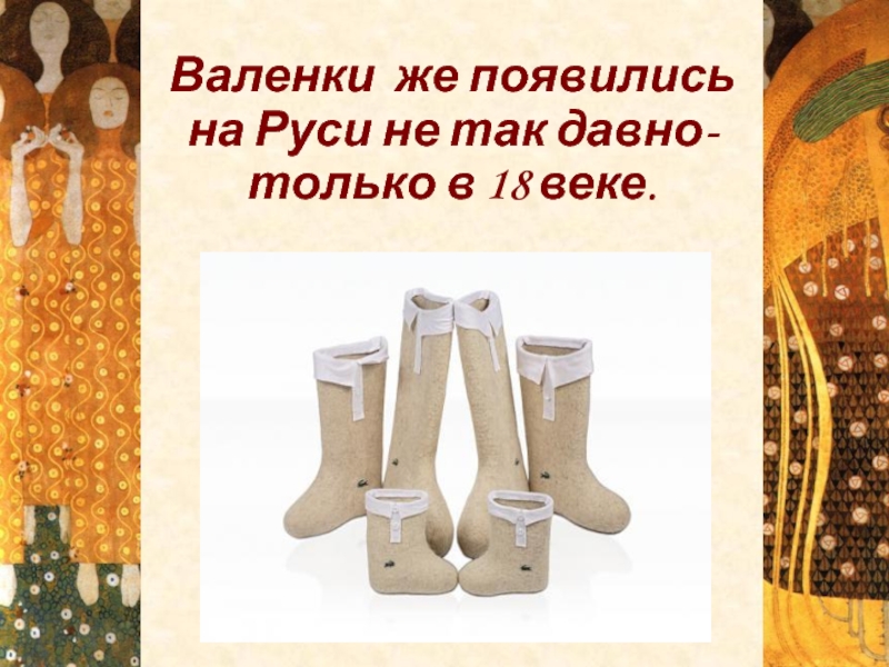 Слайд 14Валенки же появились на Руси не так давно- только в 18