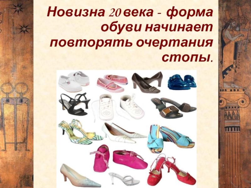 Слайд 15Новизна 20 века - форма обуви начинает повторять очертания стопы.