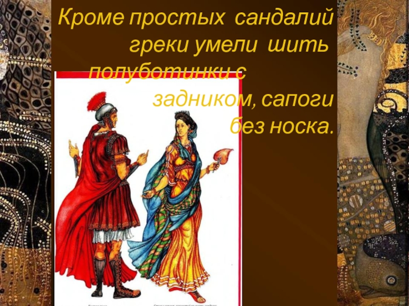 Кроме простых сандалий греки умели шить 	полуботинки с 				задником, сапоги без носка.