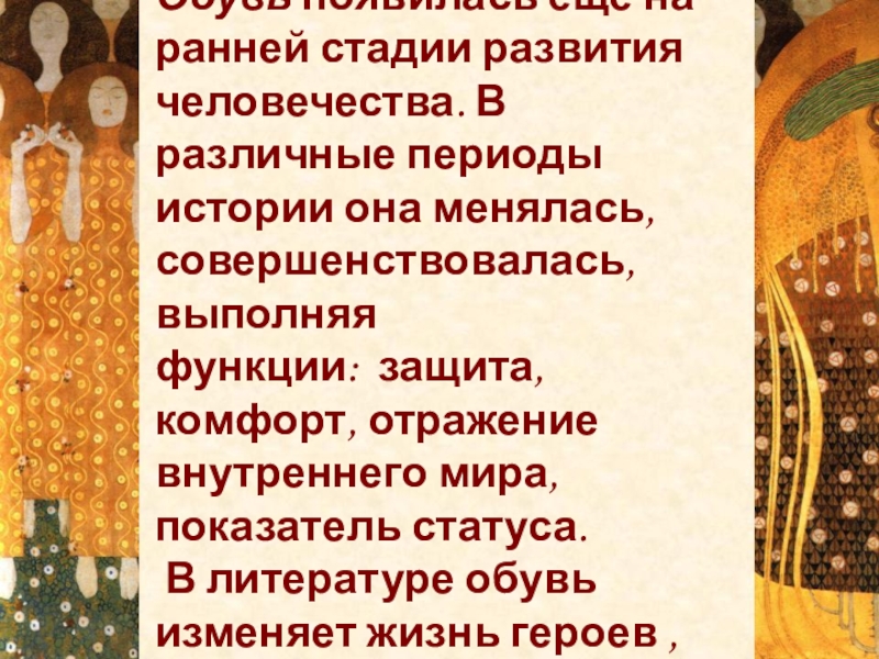 истории она менялась, совершенствовалась, выполняя функции:  защита, комфорт, отражение внутреннего мира, показатель статуса. В литературе обувь изменяет жизнь героев , приносит сказочное богатство и счастье.