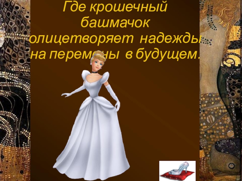 Слайд 23Где крошечный башмачок олицетворяет надежды на перемены в будущем.