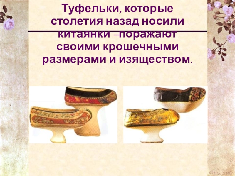 Слайд 12Туфельки, которые столетия назад носили китаянки –поражают своими крошечными размерами и