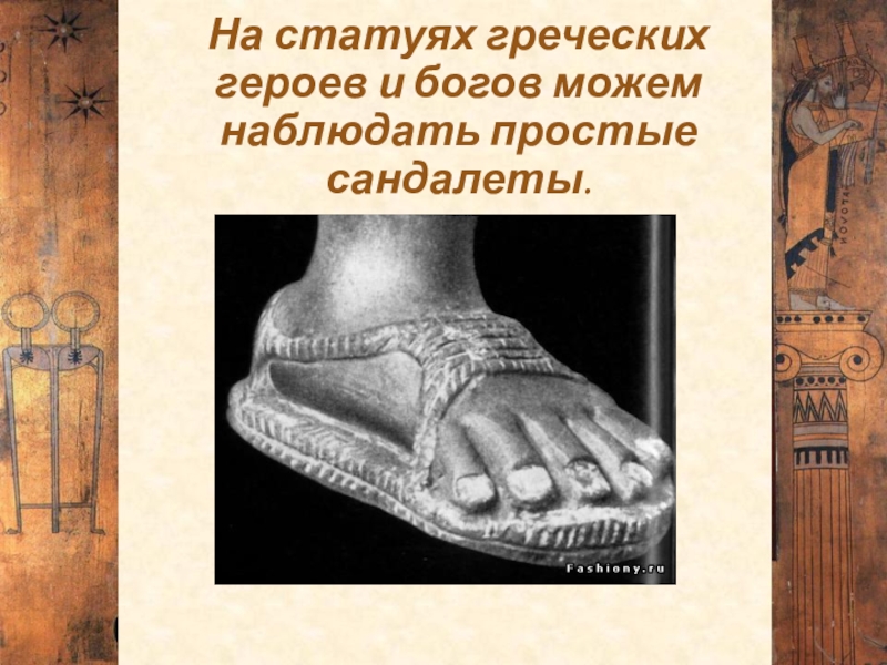 Слайд 7На статуях греческих героев и богов можем наблюдать простые сандалеты.
