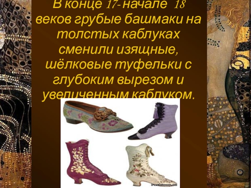 В конце 17- начале 18 веков грубые башмаки на толстых каблуках сменили изящные, шёлковые туфельки с глубоким