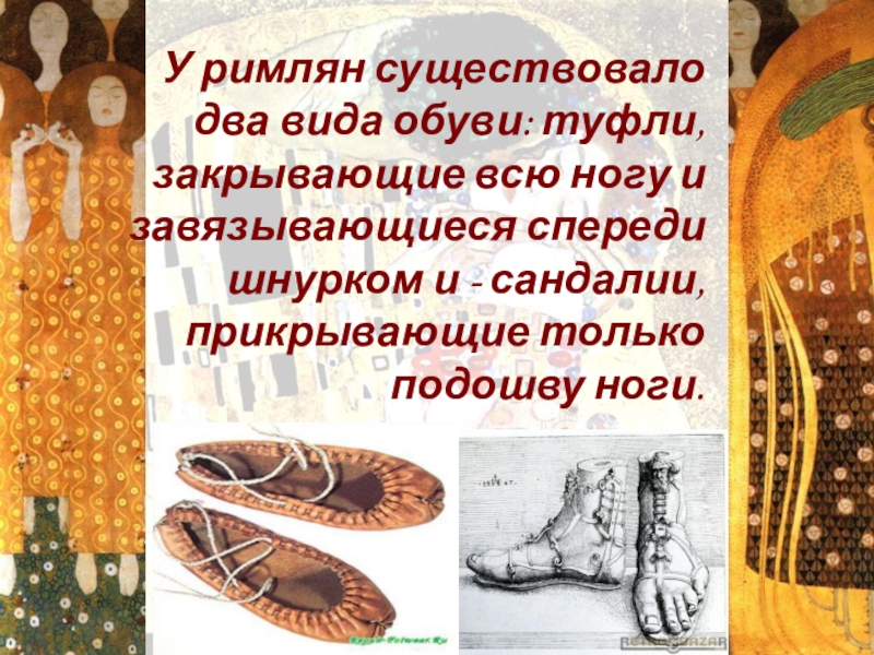 У римлян существовало два вида обуви: туфли, закрывающие всю ногу и завязывающиеся спереди шнурком и - сандалии,