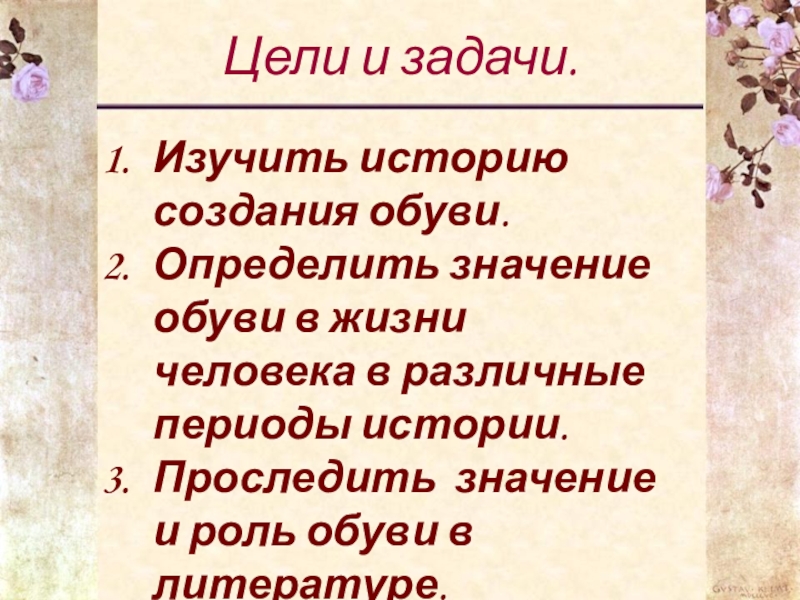 Цели и задачи.Изучить историю создания обуви.Определить значение обуви в жизни человека в различные периоды истории.Проследить значение и роль обуви в литературе.