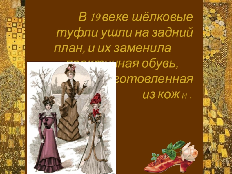 В 19 веке шёлковые туфли ушли на задний план, и их заменила 		практичная обувь, 		изготовленная из кожи.