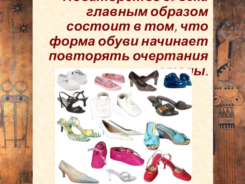 Слайд 19Новаторство 20 века главным образом состоит в том, что форма обуви