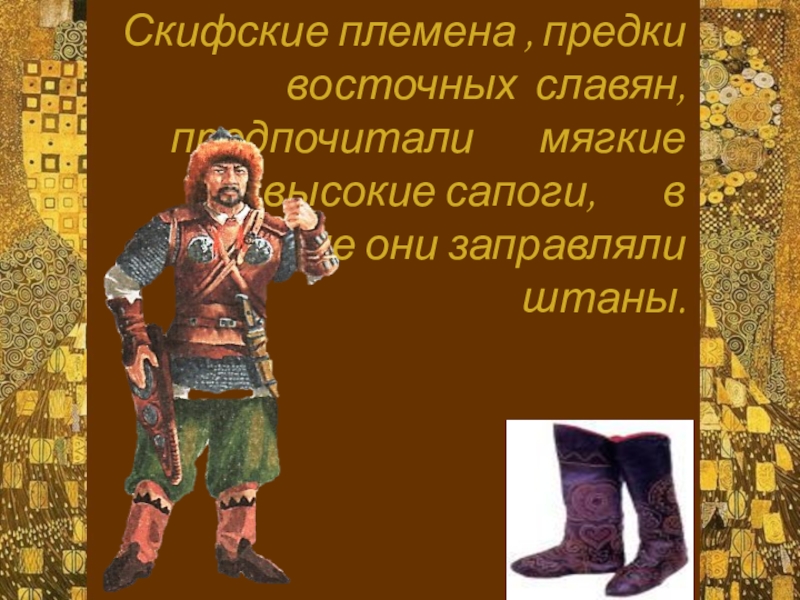 Скифские племена , предки восточных славян, предпочитали	  	 мягкие высокие сапоги, 		в которые они заправляли штаны.
