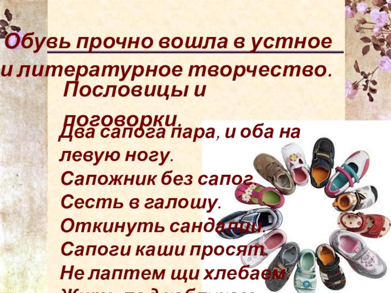 Пословицы и поговорки.Обувь прочно вошла в устное и литературное творчество. Два сапога пара, и оба на левую