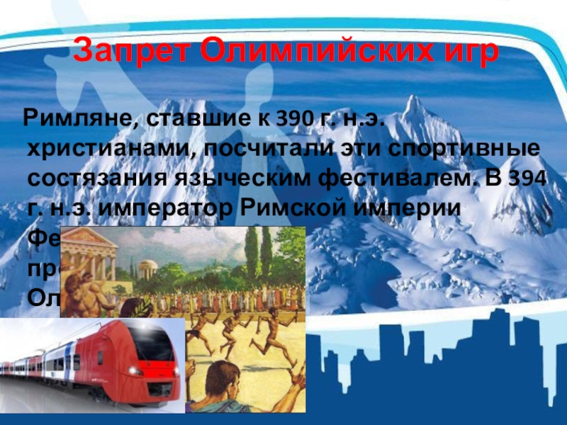 посчитали эти спортивные состязания языческим фестивалем. В 394 г. н.э. император Римской империи Феодосий I запретил проведение Олимпийских игр